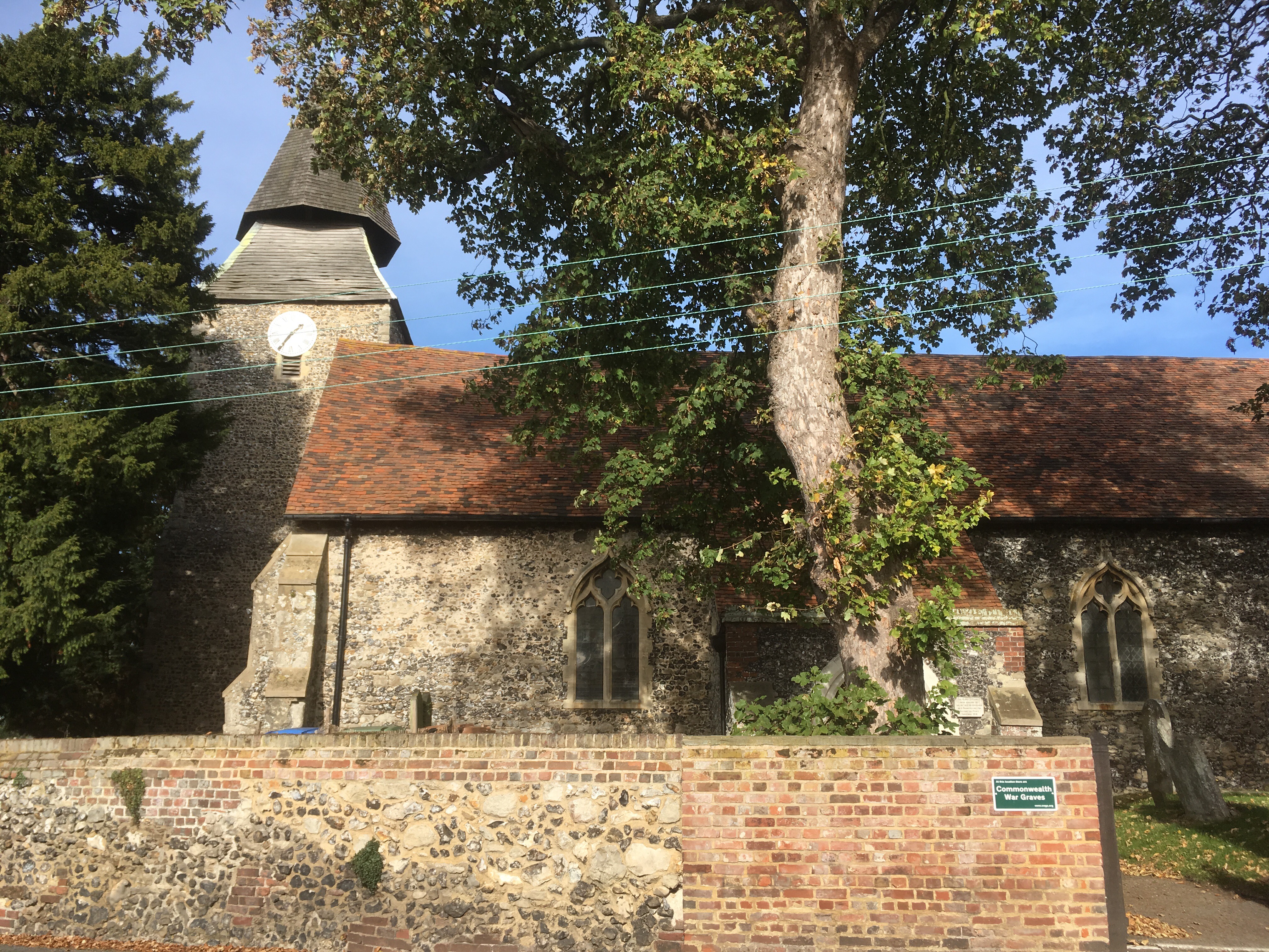 Up past fields on either side and soon I was at the village of Upchurch. As I passed the said church (St Mary’s the Virgin), a quick glance to the left and I noticed a small green sign indicating Commonwealth War Graves. With the sun high, and a good few miles under the belt, it seemed to be a good time to stop and have a short wander. An attractive flint building with a four-sided spire which seemed to have been concussed by the implantation above of a wooden spire structure with eight sides. The graveyard led past the entrance and then on down the slope of a hill, where more recent burials had extended the land. The handful of war graves, in various spots, were easy to pick out by their common design and well-maintained white marble plots.