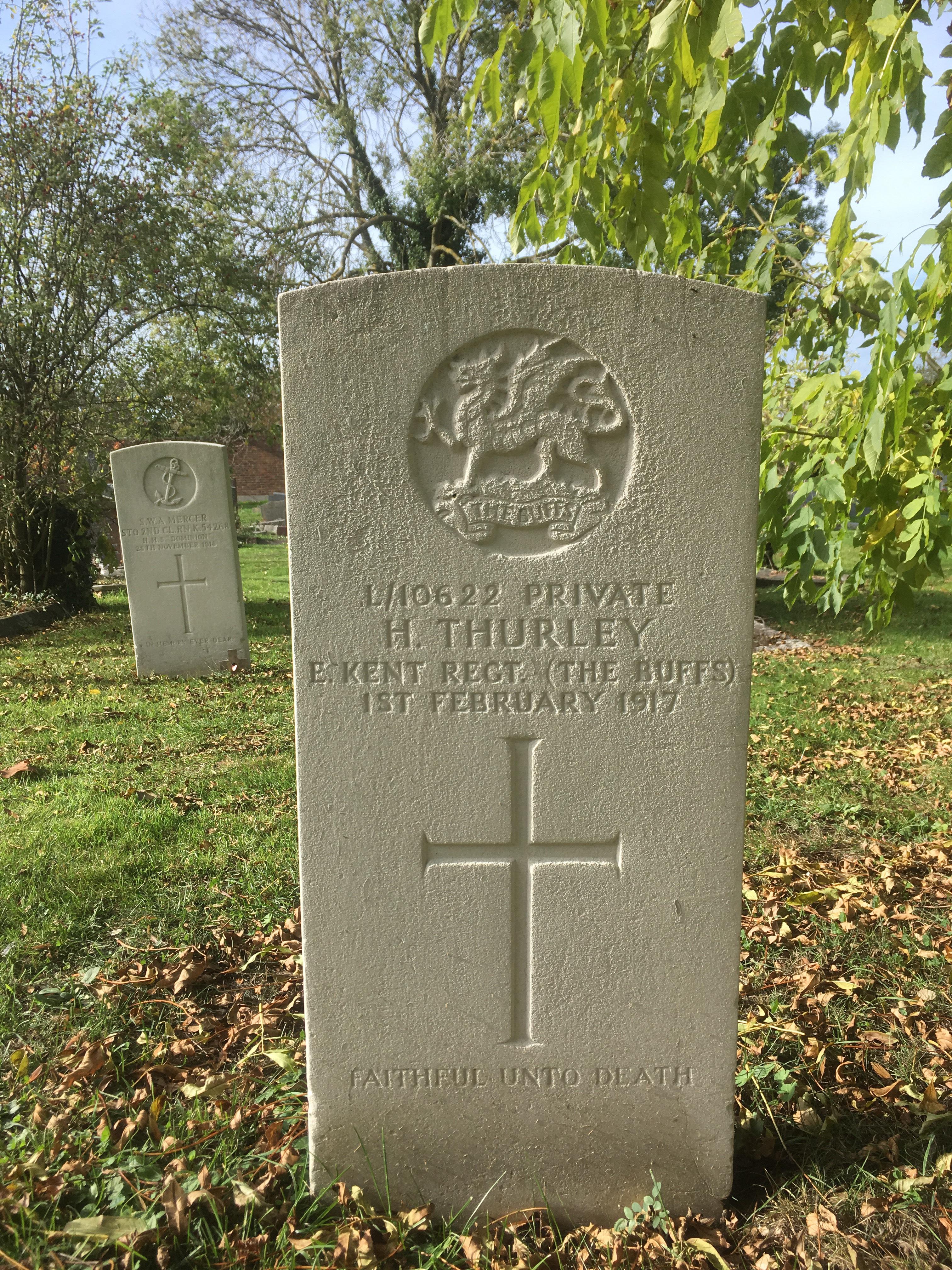 There was a Private H Thurley of the East Kent Regiment (The Buffs), killed on the 1st February 1917. Stoker (1st Class) William David Baker died on the 20th October 1918 whilst serving on the HMS Valentine, a new destroyer that went on to play a part in the Second war but which took too much incoming from some Germans Stukas off the Dutch coast and lies there still. Stoker Baker seems to have been unlucky. Just 22 days short of the end. Corporal A V Stapleton of the Royal Engineers was just 9 days short of the Armistice; 2nd November 1918. There seemed to be an emerging pattern. The only other grave to be found was Stoker 2nd Class S W A Mercer, who was serving on the HMS Dominion on 28th November 1918; just 17 days after the peace. By that time the HMS Dominion was an accommodation ship berthed at Chatham. Who knows how Stuart William Arthur Mercer died, but he was 28. Possibly of his wounds? He was born at Rainham, but by 1901 was living in Upchurch and married at this church in 1914, just four months after the war started. You can find this on-line, along with a comprehensive family tree going back to the late 18th Century. There were a lot of Fishers and Mercers in the family line, agricultural labourers mainly, but also a couple of policemen (M) and a school teacher (F). Someone had gone to some lengths to put this together, and as a portrait of what a mainly rural life must have been like leading up to the 1st World War, it makes for an interesting read.
