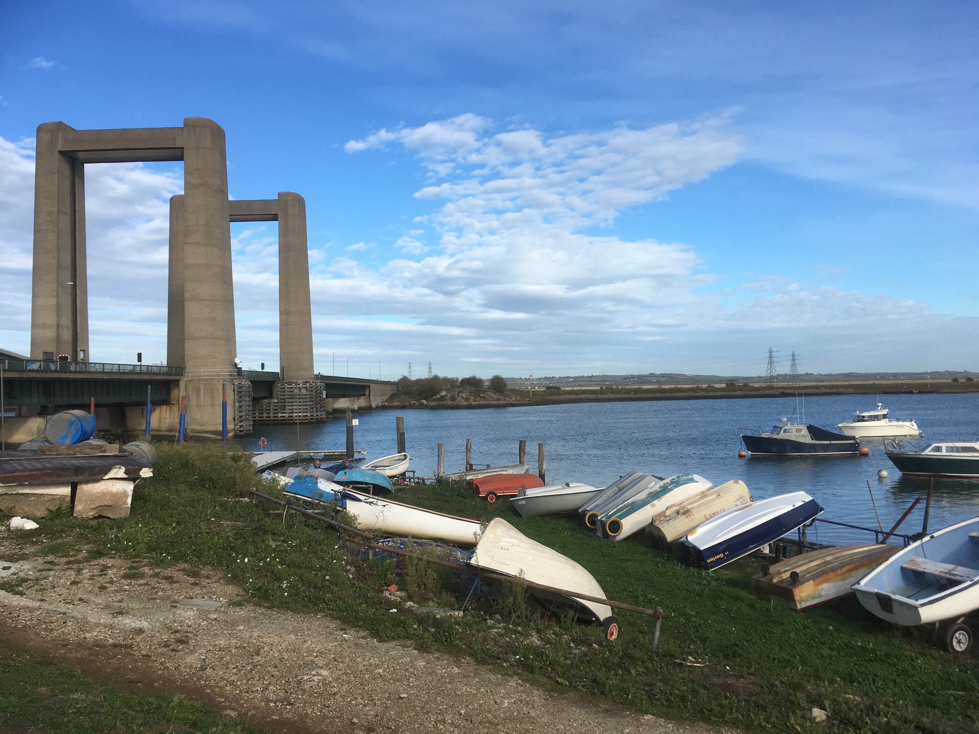 Over the river, and then past the attractive church (which lacked a second spire), the lane passed out and beyond the village to a wider road that headed back in land. Another low peninsular stretched to the north. Almost certainly I was missing out on more coastal walk action, but I really had had my fill. The view between the hedges provided the occasional glimpse of the water that lay between the mainland and the Isle of Sheppey. Then along the shore of a bay before crossing more land and low hills that eventually provided a much better view east and towards the road and train bridges that crossed the Swale (the expanse of water dividing the island from the land. The land here was flat; reclaimed and although still full of late summer green, desolate. At the bridges a path did lead to the riverbank. A police 4×4 sat idle at the end of the path. Presumably a late lunch before another shift on the Kent highways.