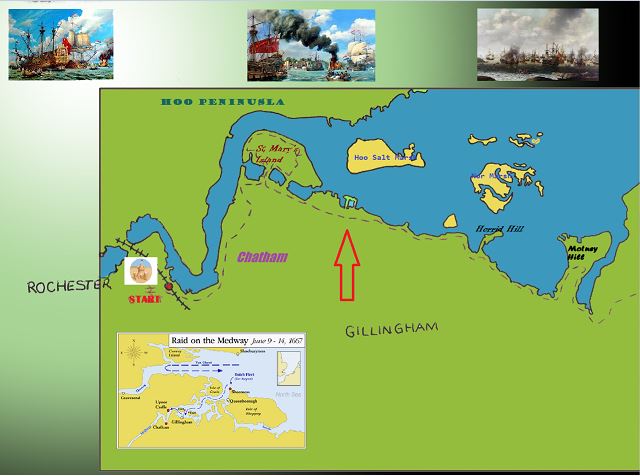 Now you’d think, wouldn’t you, that this was more than enough history for a few acres of inhospitable marshland. But fear not, there’s a lot more to it than that, and perhaps the most interesting historical detail reminds us of the important truth that if you fail to invest in the infrastructure of State, the best laid plans can still, and often do, go pear shaped. In this case the plan was very actually laid across the river, from St Mary’s Island to Upnor Castle on the Hoo peninsular opposite.