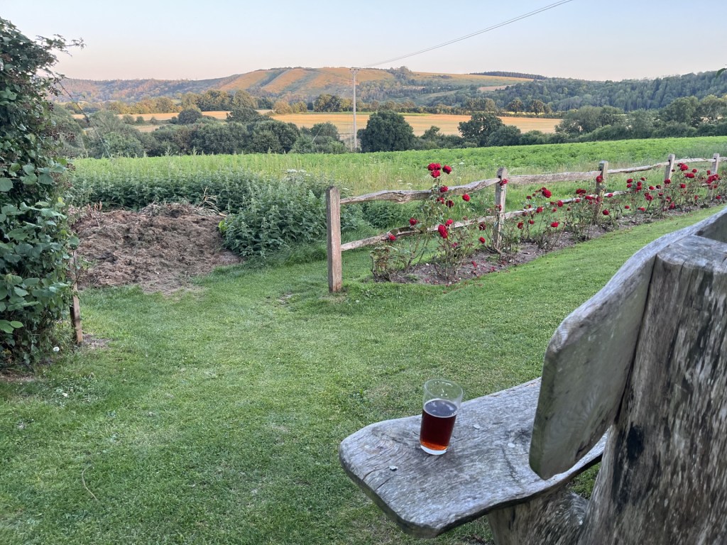 Half an hour later, and after another steep climb, this time up the west slope of the dry valley, I was back at the car park, and by seven back at the campsite and then at the pub. They served food till 8.30pm, on a Sunday night. The garden was full of customers, and with an exceptional view back towards the Downs, the low sun blushing the slopes, it was no surprise.