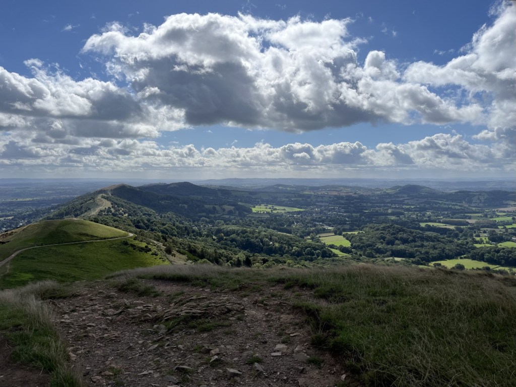 Having decided to rule out a late summer getaway to Greece, on the grounds it was going to be too much hassle and inflated prices that didn’t reflect the quality of the accommodation, I decided instead to book a few nights in a studio near Great Malvern, and go seek out some end of season county summits. Given that I was not going to be a million miles from Great Malvern, logic dictated that a walk in the Malvern Hills, and to the top of Worcester (or Worcestershire) Beacon, would make a good start. I packed my bags, threw in my copy of The Old Straight Track, took on a 48-hour grandparenting shift in Bedfordshire, then drove across the Midlands in torrential rain and arrived on Tuesday evening at my digs in the foothills of the Malvern Hills. It was mid-September and unseasonably cold. Wondering if I should have put a bit more effort into the Greek thing, despite the conditions, the late evening view of the hills had me smitten.