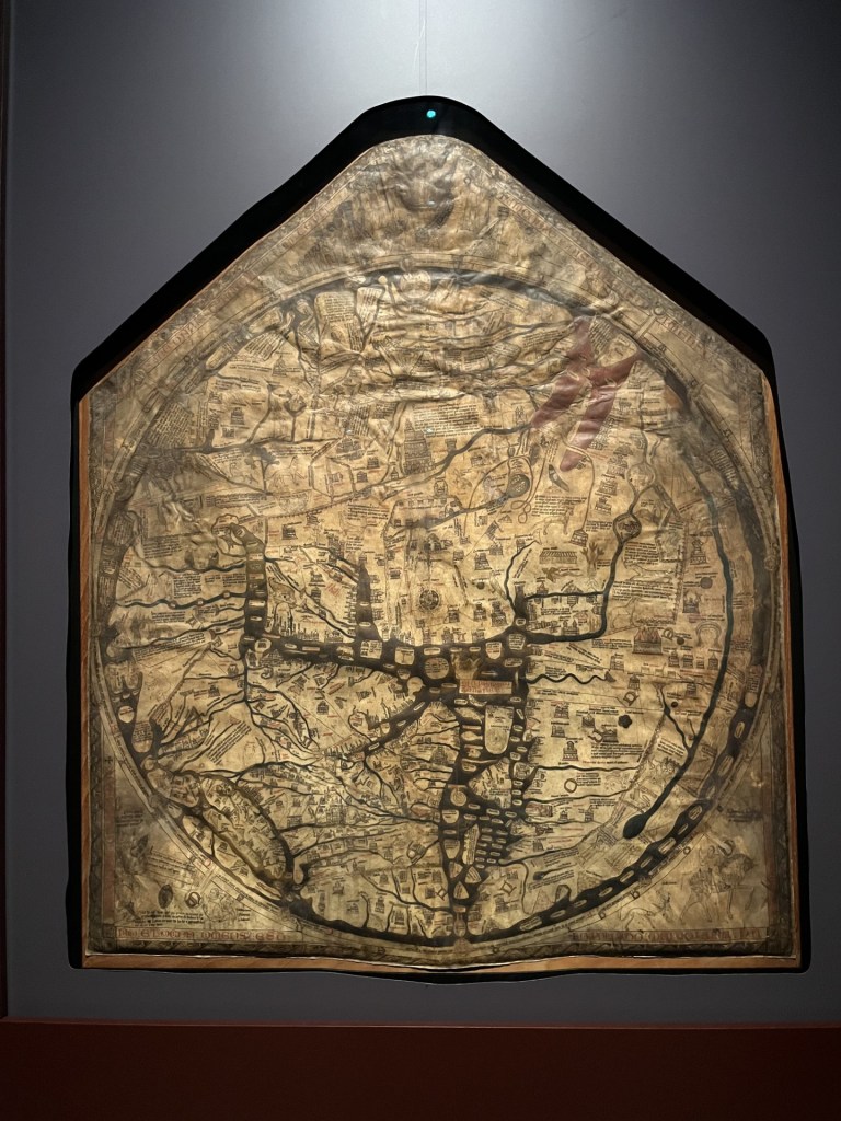* Seems the Mappa Mundi is in Hereford Cathedral. Two days later I took a train to Hereford, found it to be a pleasing town, and spent an hour in the excellent cathedral library, where the Mappa Mundi can also be found hanging, more or less, intact.