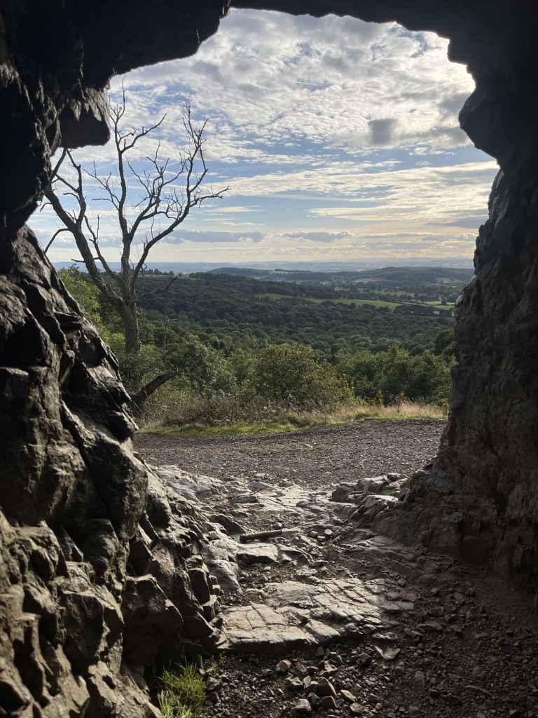 I entered the cave and was immediately struck by a ghostly black handprint on the back wall. Clearly evidence of neolithic cave art, and I was surprised that Watkins hadn’t noticed or mentioned it back in 1924. Or maybe it was a Banksy? Either way, and whatever the explanation, I looked out from the cave, and with the dipping sun blushing the Welsh borderlands, I could easily see how it was possible to hang a mystery around the location, and speculate on a time when our ancestors navigated astral planes rooted to points, natural and manmade, on the landscape.