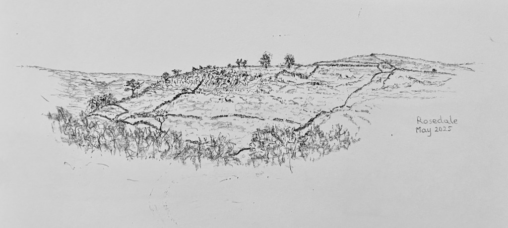 Monday morning had arrived and so had an annoying band of low cloud and slashing rain (we’d hoped for a walk before leaving). No point complaining, even a thimbleful of the wet stuff would have been welcomed by the farmers. I finished off a quick sketch of the view towards the west slopes (a faint line hints at the old railway).