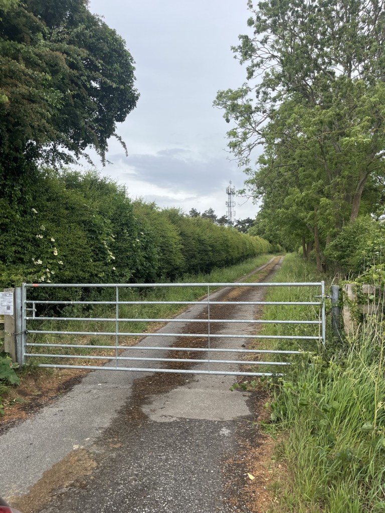 In hindsight I believe the problem I had was that my destination was on an unnamed road, which meant that I was in a perpetual state of confusion. Somehow or other (luck I guess) eventually I was driving south on a small road that from what I could recall of earlier on-line research felt familiar. A small row of whitewashed cottages appeared on the left with fields in all directions. Fifty metres on and again on the left a side track and a large metal gate. I pulled over, knowing I had arrived. The gate was locked. I knew it would be. The track headed east and rose slightly to a higher point about a hundred metres beyond. A CCTV sign on the gate made it clear that whatever lay beyond was private property.