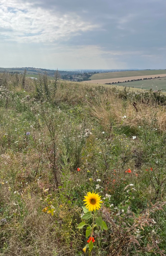 After a mile or so a slight bend in the road and some land set aside for wild planting offered an opportunity to inspect some colourful flora. Looking towards the southwest the view towards Shoreham was unexpectedly spectacular.