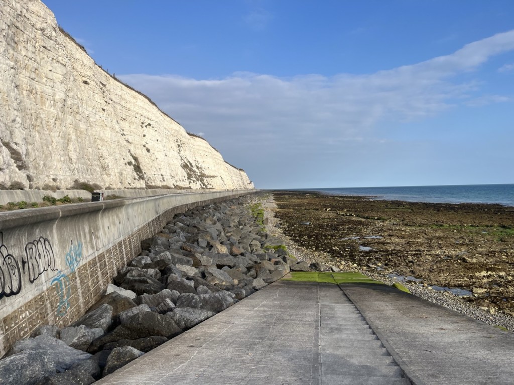 The buildings entering the town were, to say the least, eclectic, and in the main very well to do. Soon afterwards I was at the busy sea front heading west along the wide Undercliff path and under the chalk cliffs and towards Brighton. The last time I had been here had been some years back, on a cycle ride from Brighton to Eastbourne. Not a particularly long ride but trying to hoik the bike over the Seven Sisters had nearly finished me off. That was something that wasn’t going to happen again. ** Up until this point there had been a fine haze that had kept the temperature at a reasonable level, but that was now lifting, and the sun was occasionally breaking through, illuminating seaweed on the rocks below and bringing life back into the chalk cliffs.