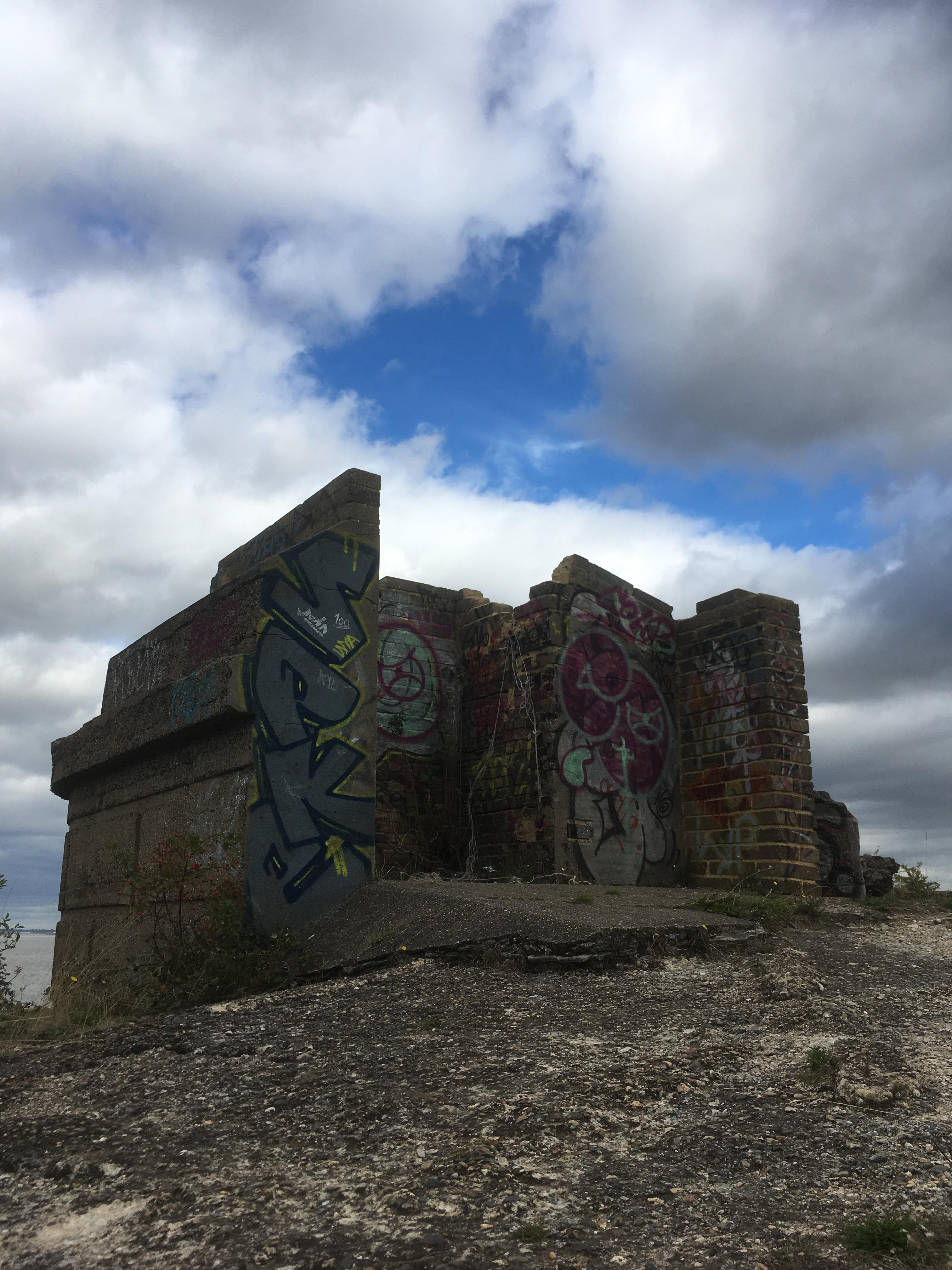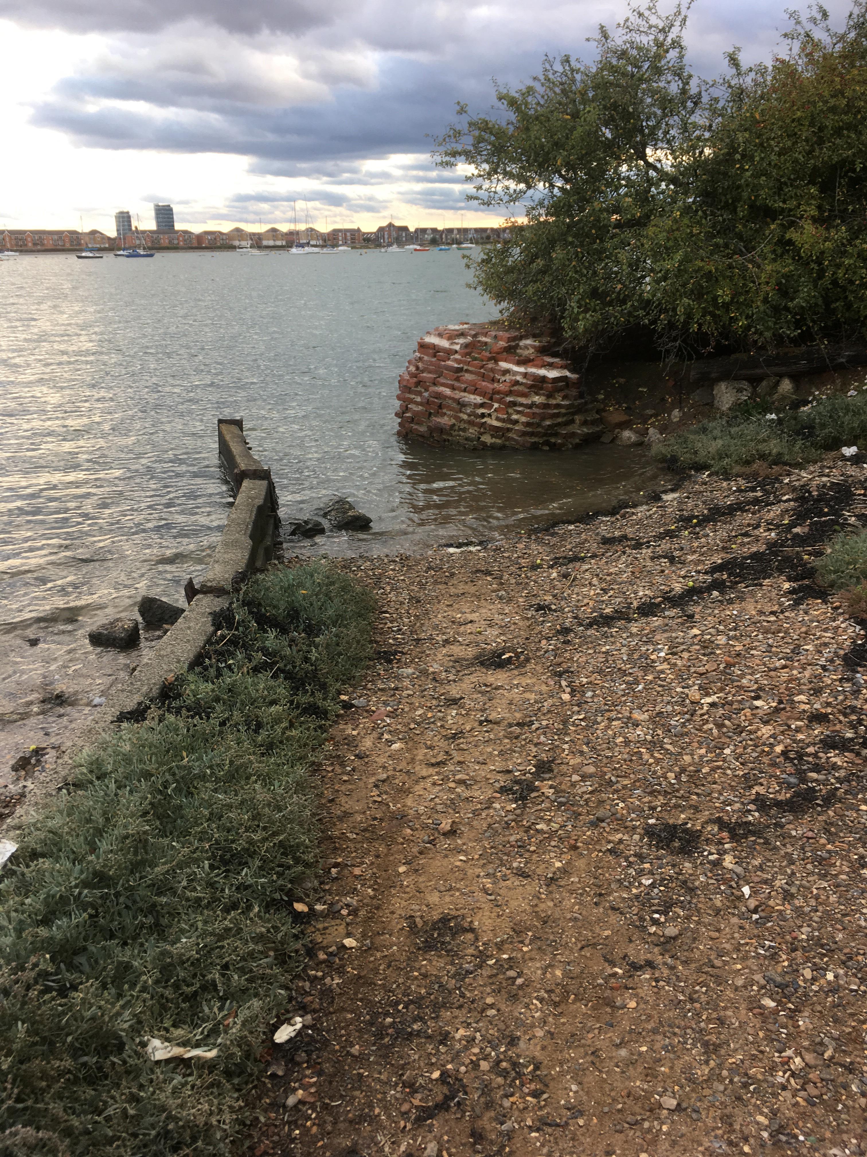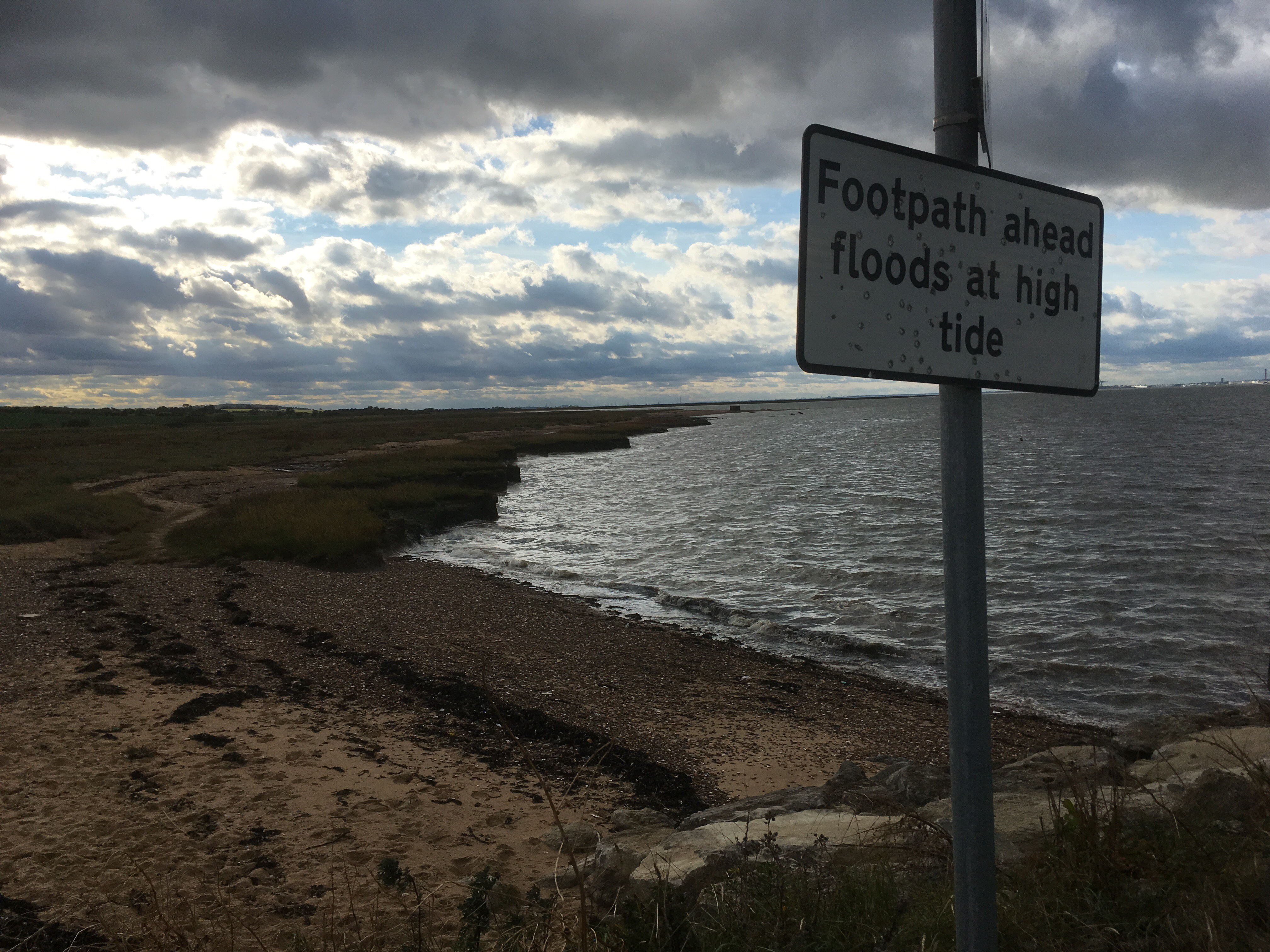 Outside I looked around to figure out the best direction of travel, and then did some loops trying to find a route to the seafront; eventually finding a path between a creek and a large Tesco’s. The seawall was wide, and to the west, at the end of the path, a tall concrete bastion of a building that clearly had WW2 associations commanded the channel of the River Medway. I headed east along a wide path on the top of the sea wall that kept the North Sea from reclaiming the town. I don’t know if there is anything to say about the Islands main town because I barely glimpsed it.