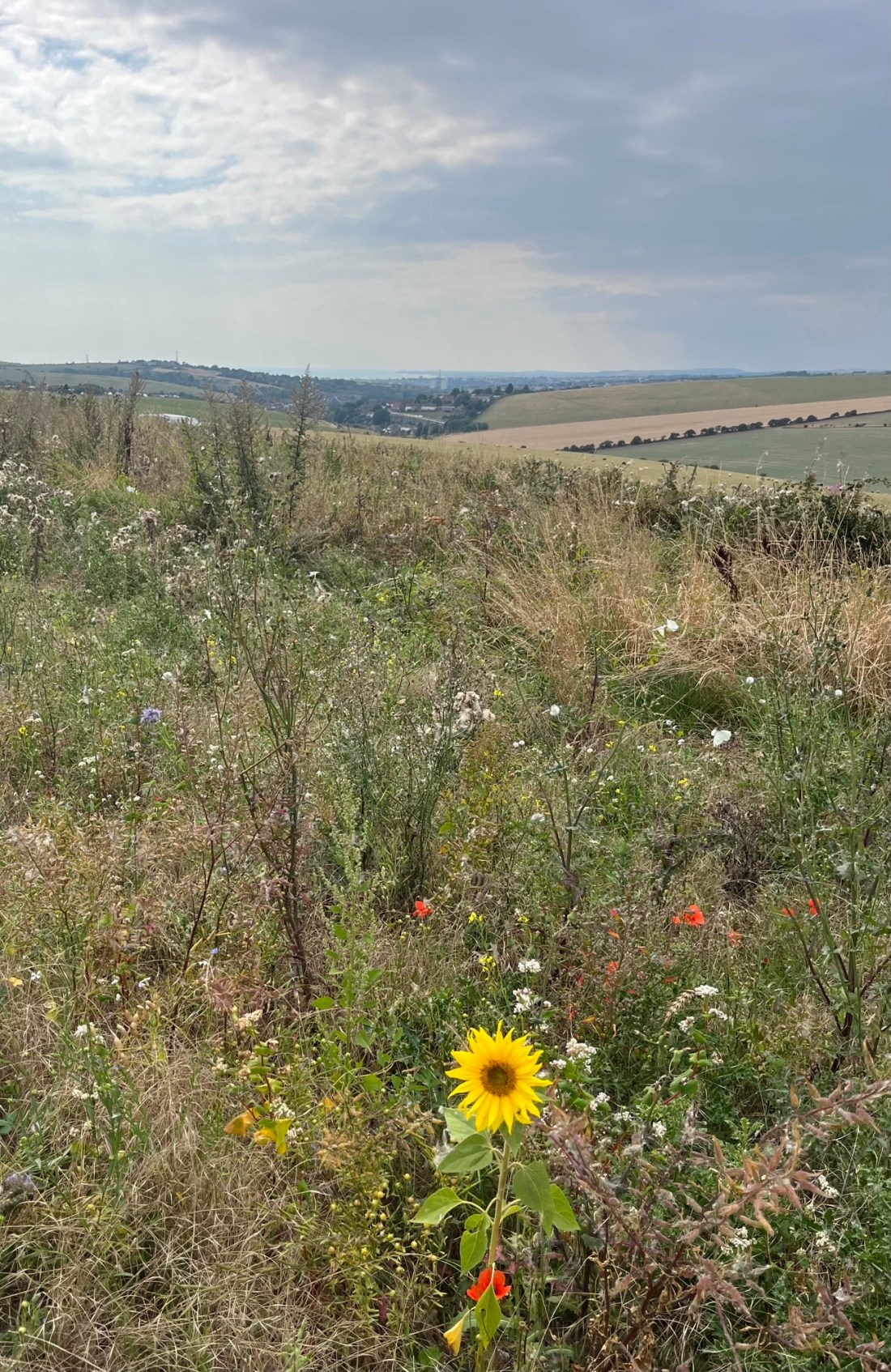 After a mile or so a slight bend in the road and some land set aside for wild planting offered an opportunity to inspect some colourful flora. Looking towards the southwest the view towards  Shoreham was unexpectedly spectacular.
